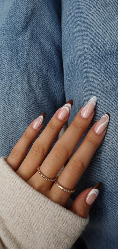 Glamorous, swanky, and very in vogue, these are minimalist brown and white swirl tips and this is what will make your fall nail art art court in style. The layout is a no-sweat classy touch–just a good cup of latte in an upscale cafe. The non-rule that is within the negative space makes it breathable, fresh and suitable to any age.