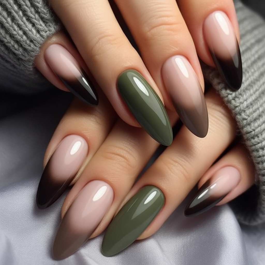It is one of these concepts that the green-minds lovers will appreciate especially when you are fond of blending tones and finishes. The almond shape makes the fingers long and the accent nail enhances the beauty by a cool surprise. It is an adventurous and innovative one in amongst fall ombr d nails 2025- designs that women, wish to stick out like a sore thumb, but in a classy manner.