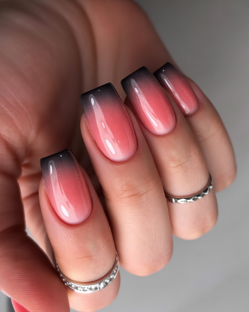 The colors of this ombr design are warm coral-pink and smoky charcoal that seem to have been designed by a cloud from an autumn sky at dusk. It is soft and at the same time moody, feminine and down-to-earth because it is the type of style that drives you to put on your most comfortable scarf and go out and have a nice long walk in crunchy dry leaves.