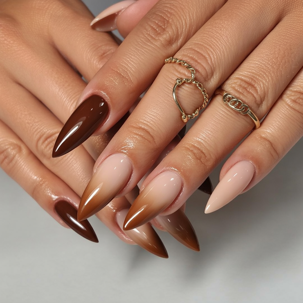 This tasty and very sweet combination of chocolate, caramel and nude gradients resembles a perfectly blended coffee drink. The story is a little different in each finger, but they are like old friends that mingle, comforting, stylish, but just a bit indulgent.