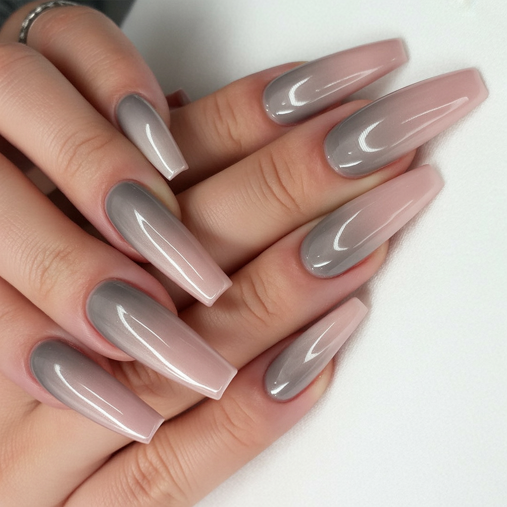 It is a subtle combination of dull gray and light blush and the quintessential quiet luxury effect. It is simple, fresh and classy like a fall trench coat in manicure style. Understated but rich with detail, this gradient whispers sophistication.