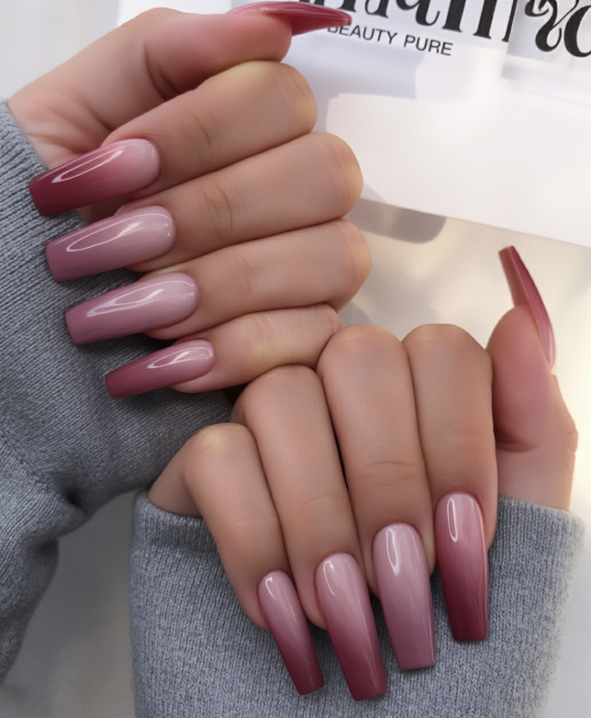 With all the autumn glow of sunsets, this soft-to-deep rosewood omre has all the warmth it brings. It is feminine, but not sugary sweet I would say it is quiet romance with a touch of attitude. Its bold finish is provided by the long square tips, but the fleeting color transition takes it back to the ground and ability to wear it.