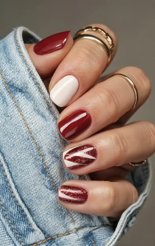 In case you want something light-hearted yet dramatic, this blend of glossy burgundy, creamy white and glittery geometric patterns will have you adding a touch of art deco style into the equation. It is playful, contemporary, and attention-getting but not too flashy, which makes this new look an excellent choice of formal wear to be a high-style wedding guest.