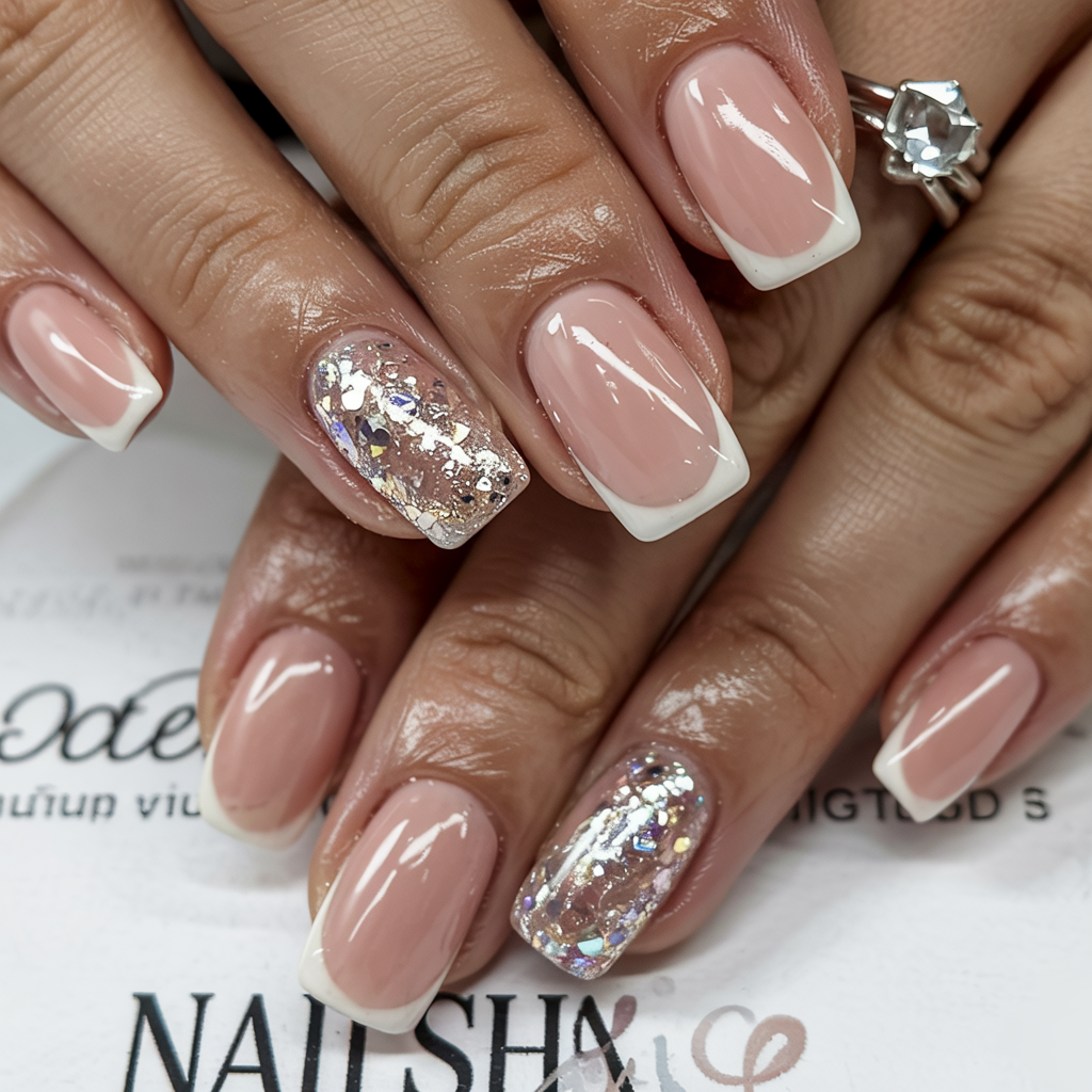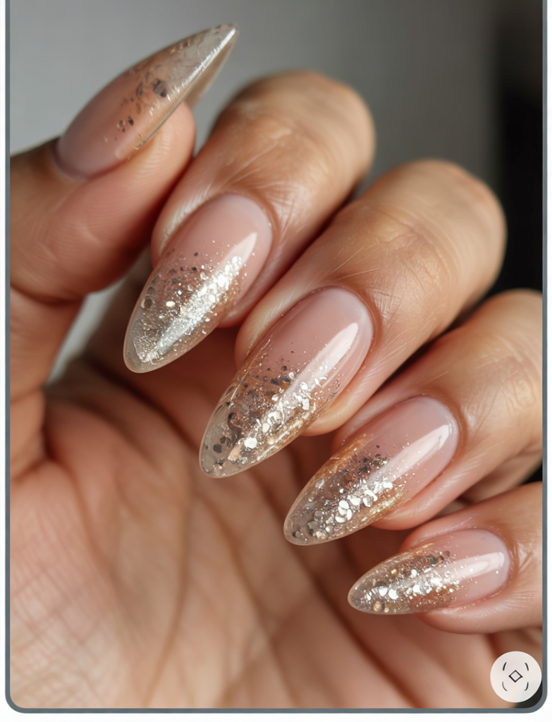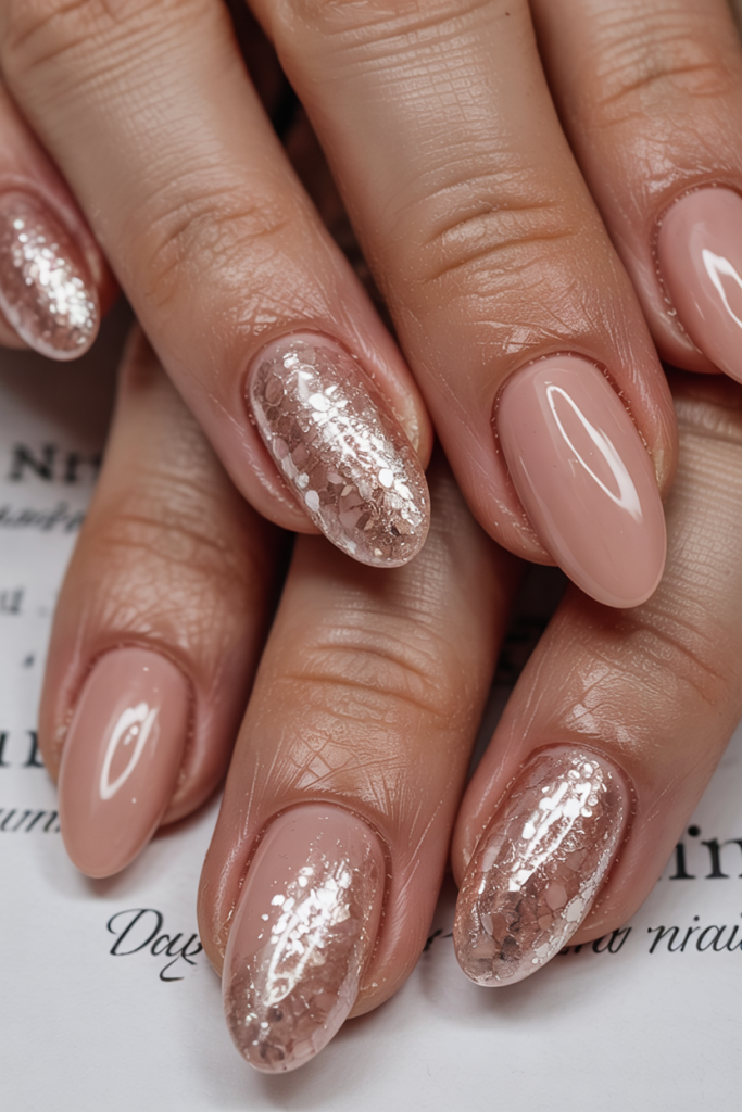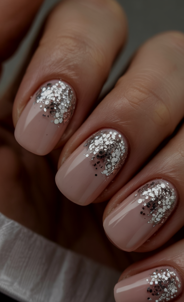 A couple of sparkly nails are always a good way to make your hands feel a bit special and this silver glitter fade over blush nails does the trick. It’s feminine, festive, and beautifully understated — the kind of manicure that makes you feel like you’re glowing from within.