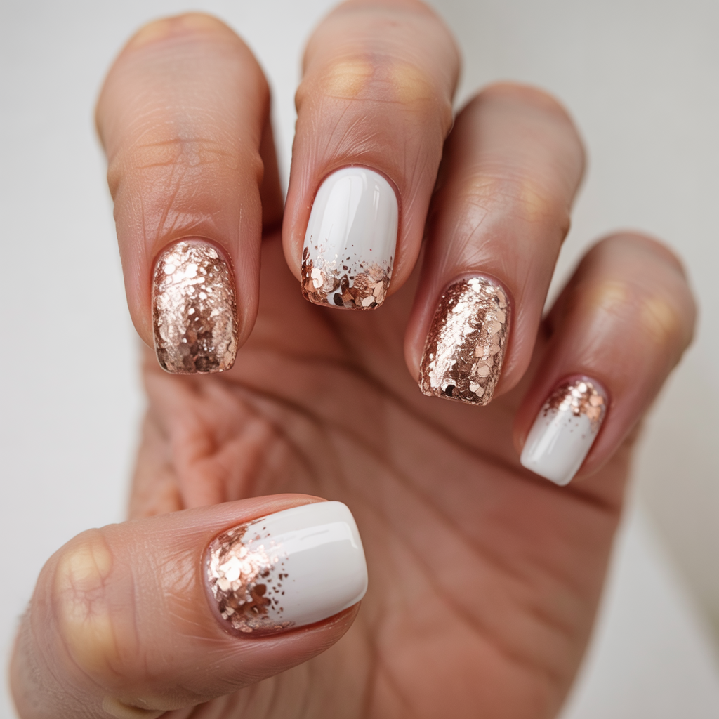 Full-on glam and clean and shiny are evident here in this glitter finished rose gold and white set. The mixture of the glitter and the neat healthy white nails is refreshing and celebratory such as champagne bubbles when you are in party. An ideal choice of a guest who is fond of standing out a bit.