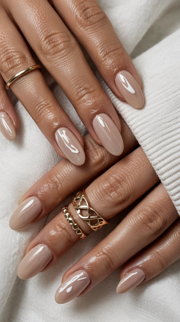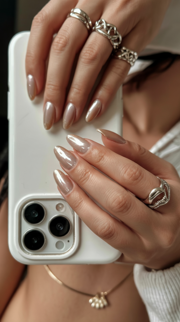 The style of these shiny, rose-hued neutral nails is that they are the same classic that does not require any other consideration. They’re understated yet polished, soft yet confident — perfect for a bride who wants quiet beauty to match the intimacy of a fall wedding.