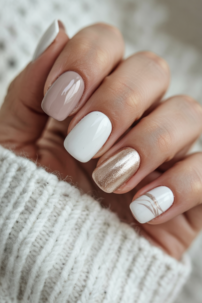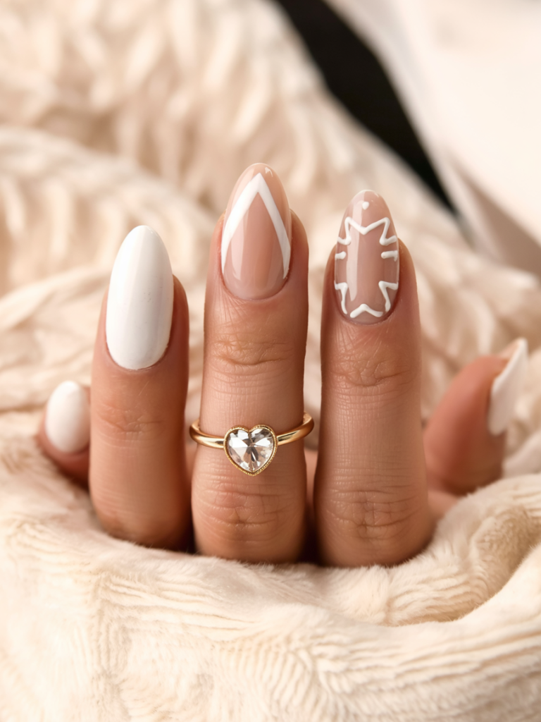 These nails are modern and playful as they combine both the pure white polish and artistic, geometric depictions of leaves. It is a clean, fun and ideal outfit to consider when having an autumn wedding in a teeny boho style. The difference is there to make the statement, but it does not distract the overall impression.