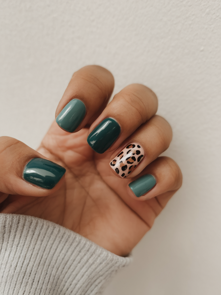 And there is an effortlessly fierce aspect to this design – a shiny olive green base colour with a striking leopard accent nail. It is a comfortable cardigan meets wild child kind of manicure, one that you can can lie in bed with your best friend before distractingly checking out a pumpkin patch. It’s playful, it’s moody, and oh-so-fall. The combination of the earthy color and animal print renders it outstanding this season.