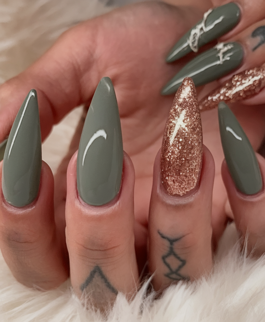 This one’s for the bold. The shiny olive nails in their combination with that showy gold-copper glitter just shouts out confident and sassy. It feels like the kind of manicure you’d wear to kick off a new chapter — powerful, polished, and ready to turn heads.
