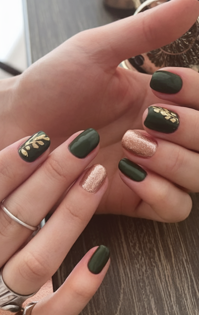 The thing is, deep olive nails with some tiny gold leaf decoration are romantic and sophisticated. Add a pop of rose gold glitter, and suddenly your hands are holiday-ready — even if you’re just sipping cider at home. This set is rich, festive, and completely chic.