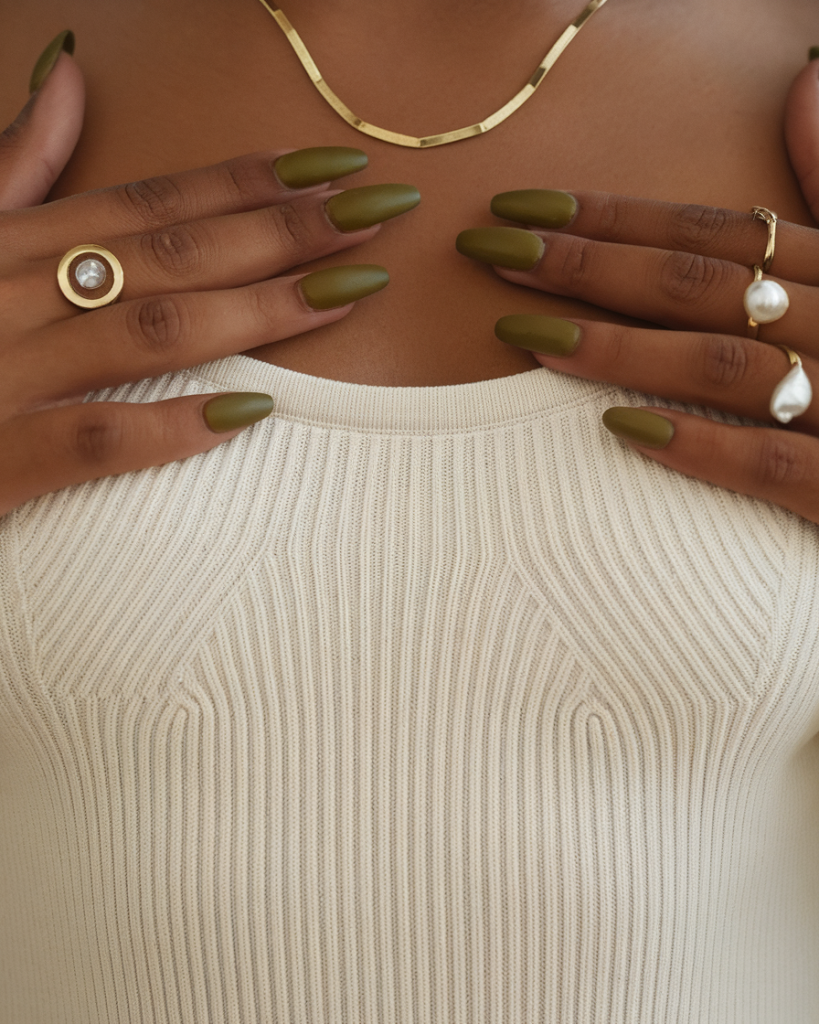 Works perfectly on both natural as well as acrylic bases, this style suits long nails with an almond shape perfectly. It flatter darker skin shades and turns a wonderful match to gold jewelry or chunky knits as well. For 2025, matte is most definitely in.