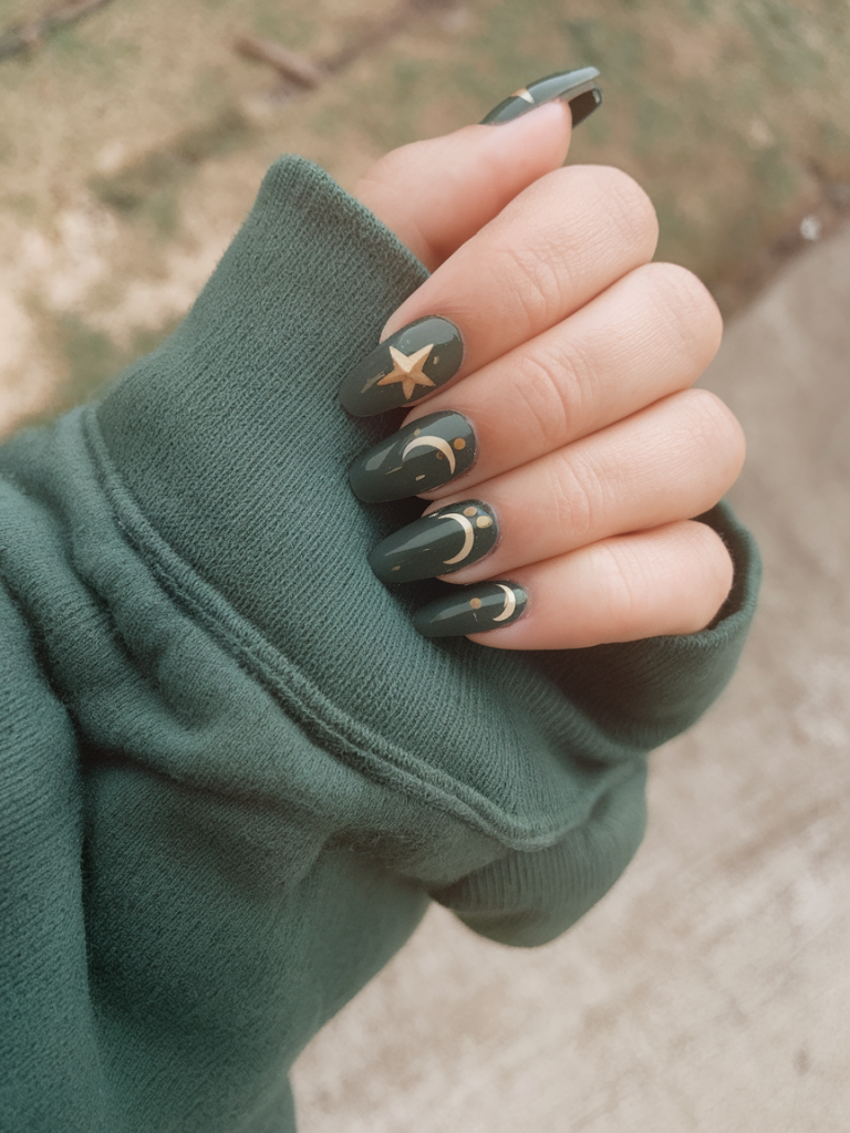 Fanciful and ethereal, this shade of dark forest green manicure is dotted with golden moons and stars garden-sized on the tip of your fingers. It gives warm hoodie evenings, astronomer gazing and witch-girl autumn vibe. Absolutely enchanting.