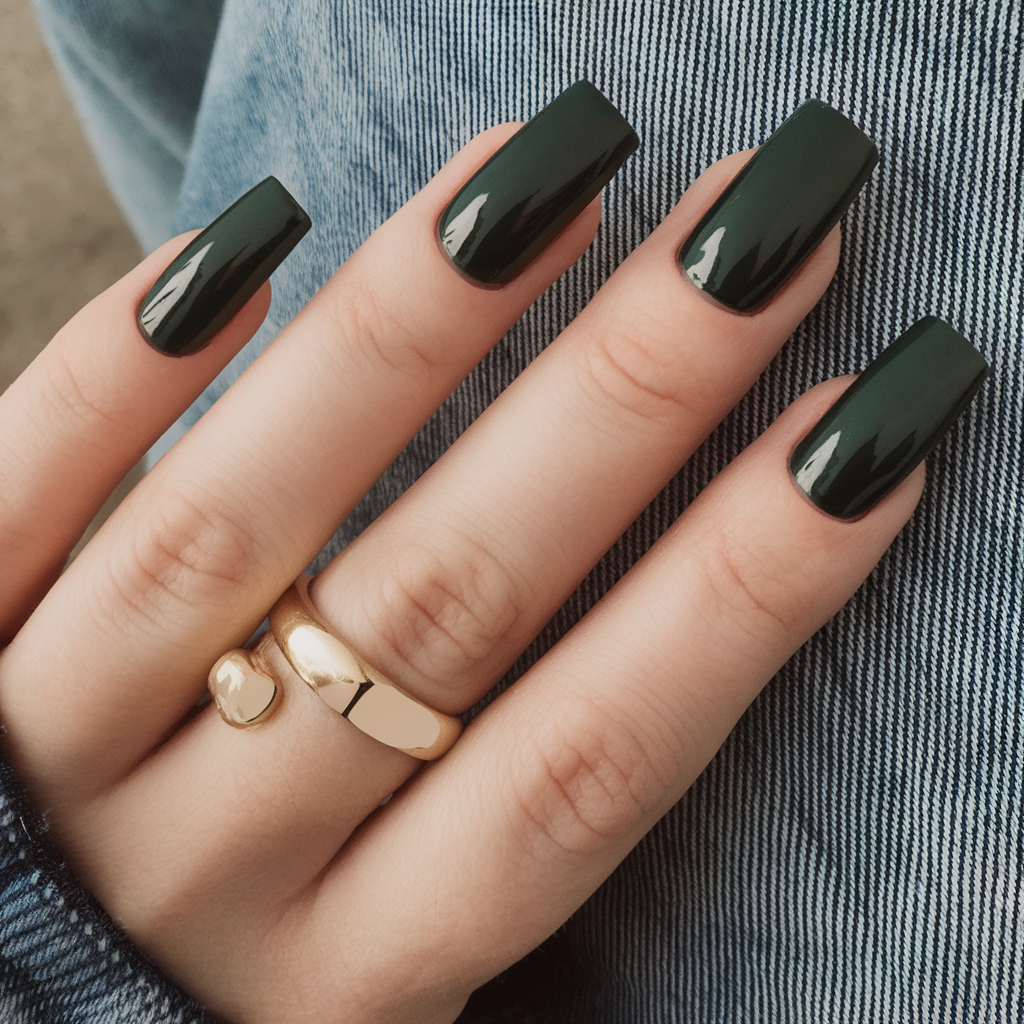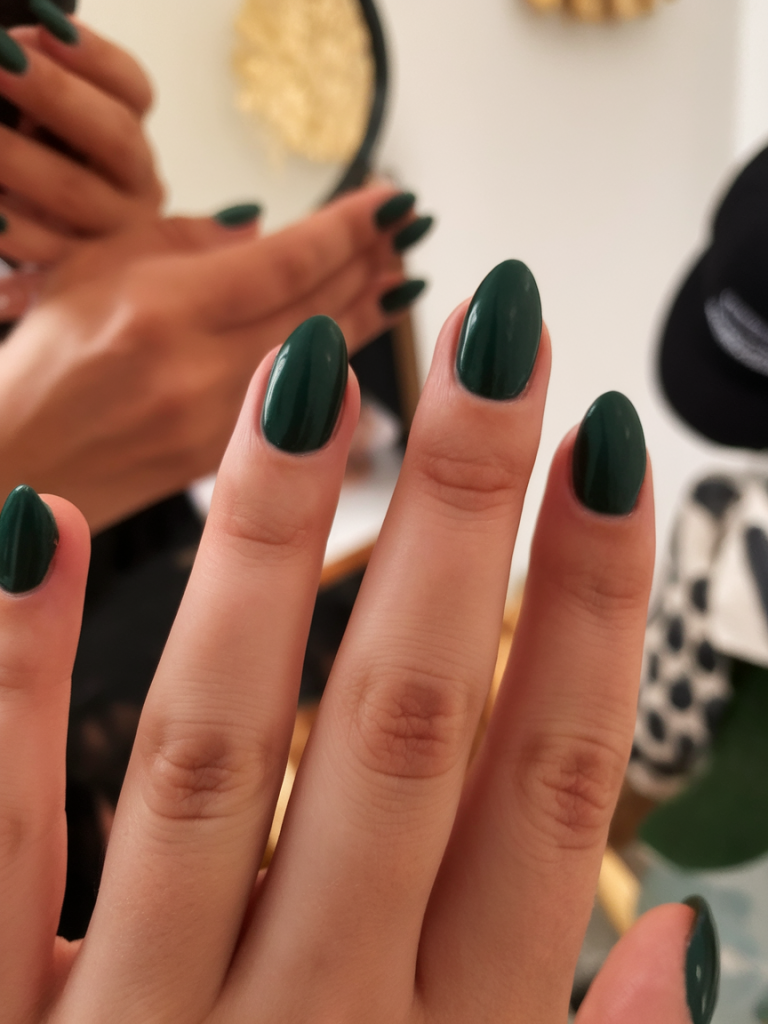 This glossy olive set is giving timeless sophistication. The dark green color is down-to-earth and luxurious, in particular, combined with a thin gold jewelry and autumn-like fluff. It is almost a manicure that seems to say without trying very hard that one is put together – ease of fall.