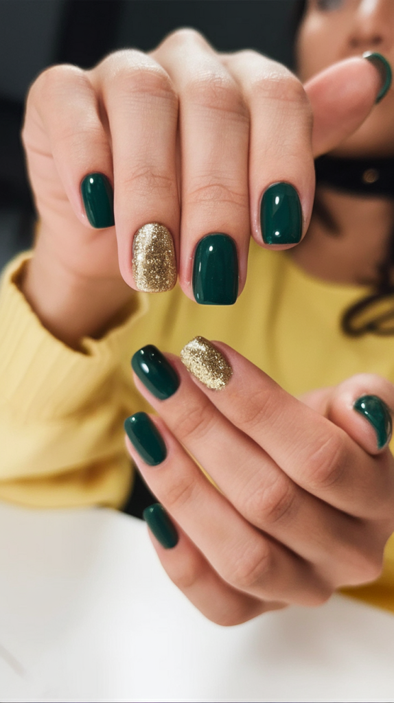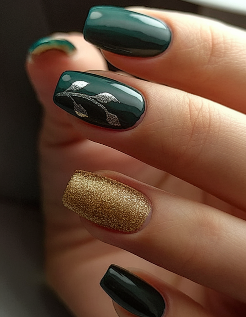 Brave, party-ready, and inescapable to the naked eye, this deep forest green manicure is given an intense makeover due to the dense gold glitter accent nails. It’s like cozy cabin vibes with a touch of holiday sparkle. Whether you’re lighting a candle or clinking wine glasses, these nails are pure glam.