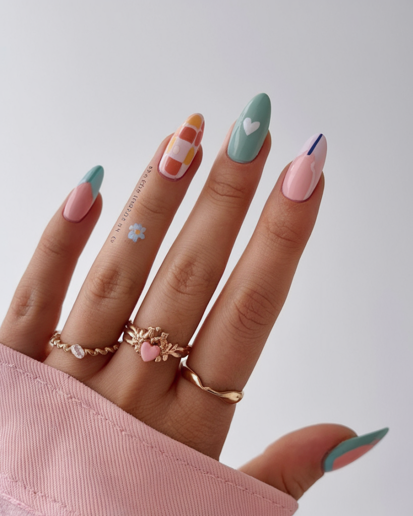 Checkerboard orange and tiny hearts, pale pink and soft mint – like a cozy quilt in nail design, this cheerful patchwork pattern is what this nail policing looks like on the baby pink and yellow nails. It’s quirky, creative, and a total conversation starter. It is ideal when you need your nail to show your fun nature.