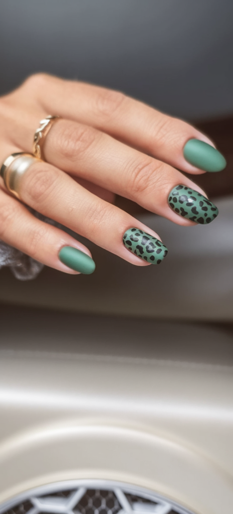 Who knew soft sage could pack such a punch? This supa-cool-bog-sultry nail combination has matte green and dots animal print with cool contrast but still, can be worn. It is your cool utility jacket, but I componentized it, make it nail art. Chic, modern, and just rebellious enough.