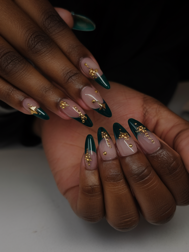 Such nails are pure drama in the best form, the deep dark forest green tips filled with fine golden stars and beads. It has heavenly meets fairy in forest vibes, with large Halloween evening vibes. You’ll feel like your hands are wrapped in magic.