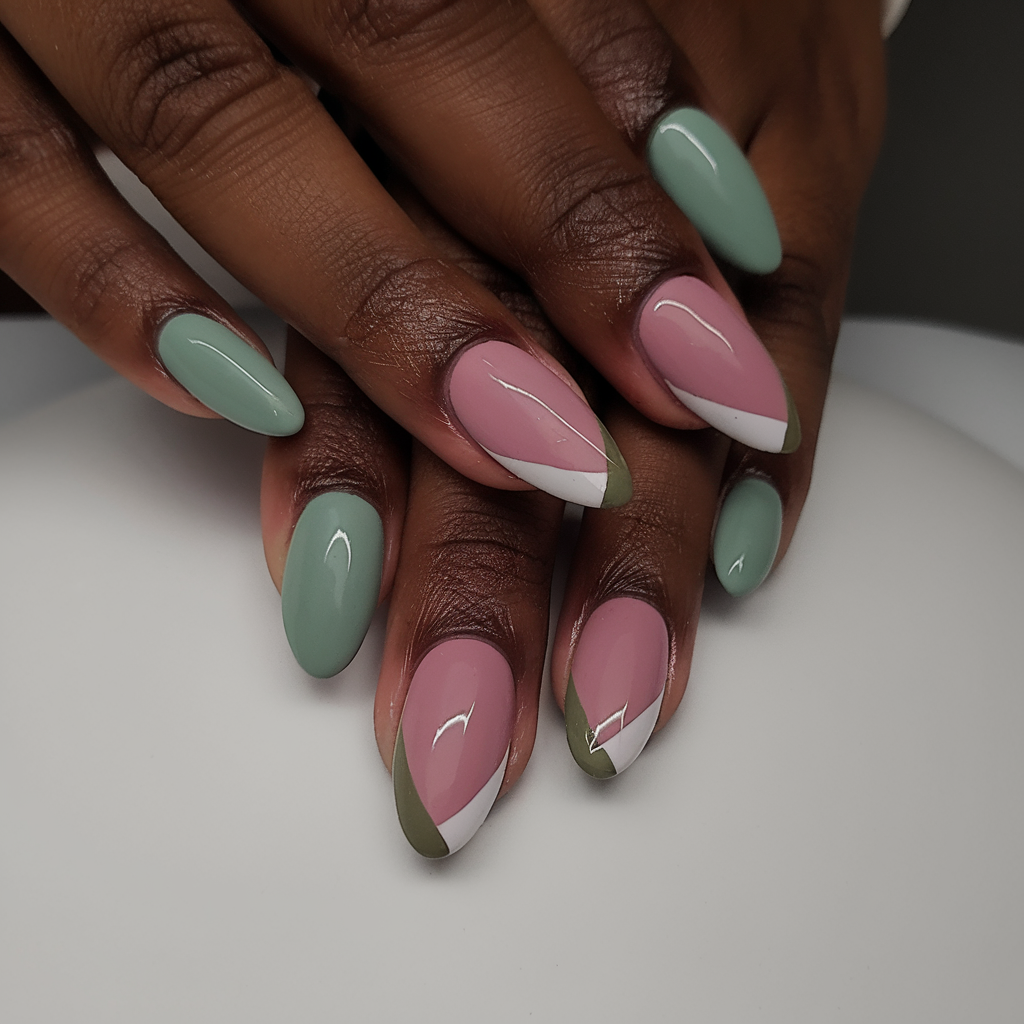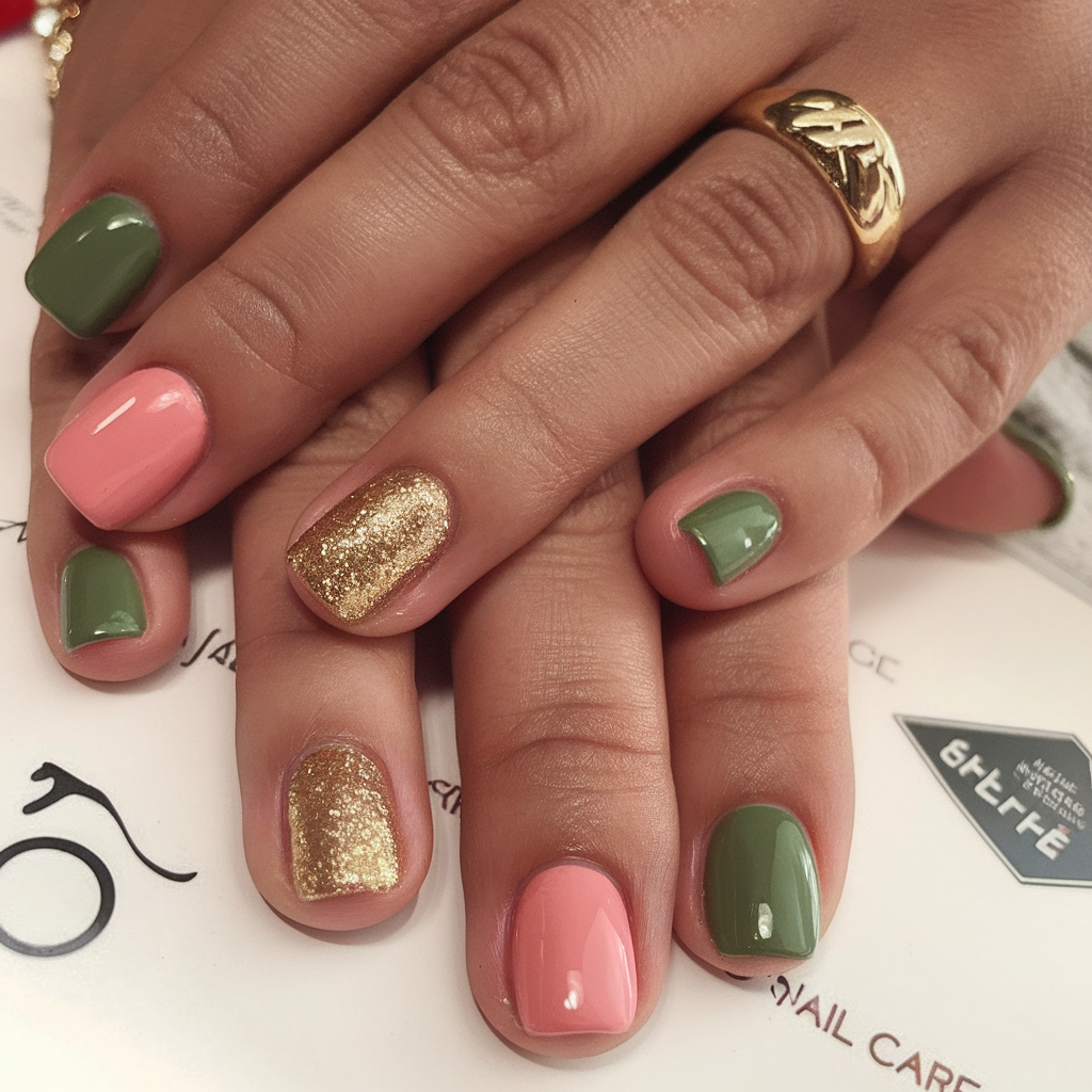 Light, non-conventional, and playful, this nail collection appears to be a small party on your fingers. Pink and olive go back and forth playing around with it plus a generous amount of gold glitter added into it, the end result being quite well rounded and still has a lot of personality to it.