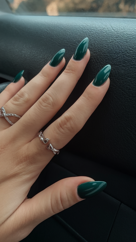 Mysterious, moody and rich, these fall elegance are polished into emerald green nails. The feminine silhouette is put with the help of the smooth almond shape and strong effect is added by the deep color. Imagine that you are sipping a hot latte or sporting thick gold jewelry this is the vibe.