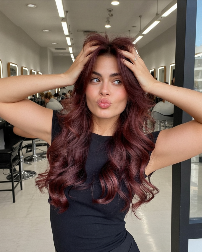 It is a gorgeous shade on brunettes who want to have a bolder color without going to any extremes. The darker tones keep it wearable whilst the burgundy hue gives this look a fun twist. It is one of the hottest colors of 2025, which fits women with long, thick hair that love their voluminous styling.