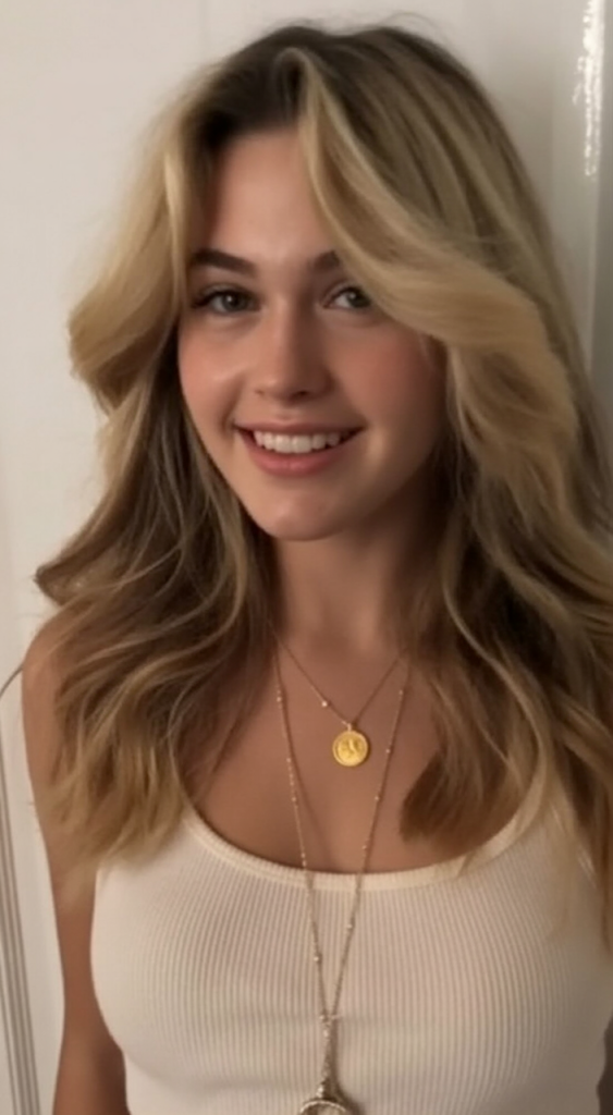 Stirring blonde waves are framing the face, offering light and movement to the style, flowing outward and waves of the hair are softened by the layers, which give open windows to the features. The highlights that lean toward light create the depth and make this style look fresher and youthful. Photo-ready, yet relaxed, it is ideal whether you are going to brunch or to a more casual wedding.
