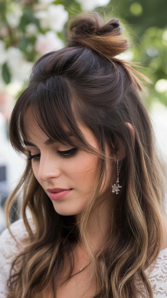 The half updo style on bangs combines both the fresh casual 21st century looks and a touch of romanticism. The thin fringe around the eyes is contrasted with the twisted knot on top that does not dominate the appearance.