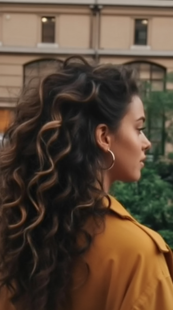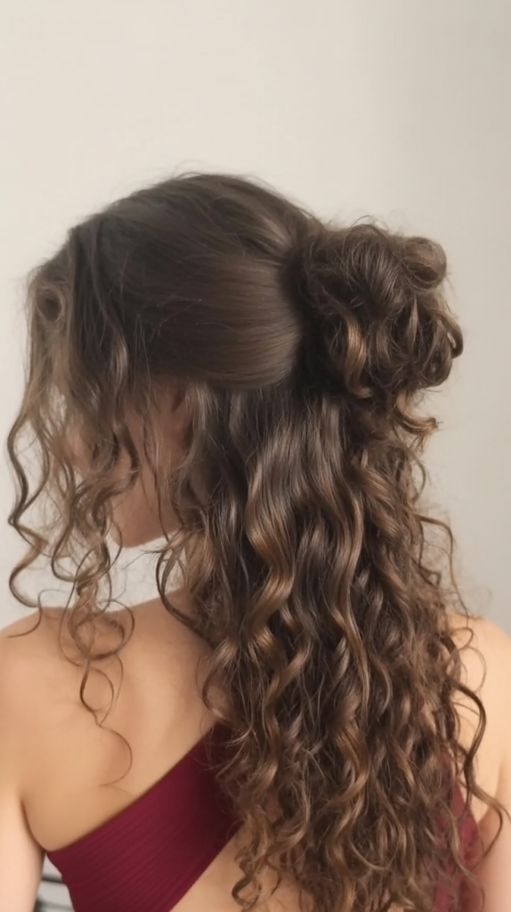 Said to be based on a high-volume curly half updo, this style is pure drama and movement with bouncy spirals tumbling down the back and providing an instant elegant look. It is the type of style that one feels that one is supposed to be getting onto dance floor or into a party. The raised crown adds volume and stature and maintains the air to be both romantic yet playful.