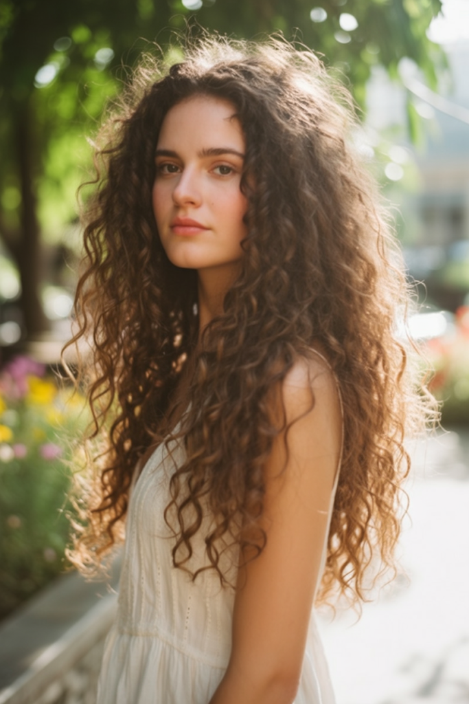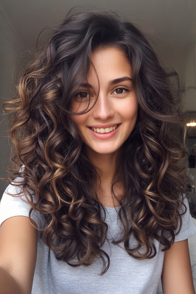 Bold, character-filled voluminous 80s inspired curls are large, audacious, and plenty. Confidence is the key behind this look and the layers make the hair quite bouncy and voluminous.