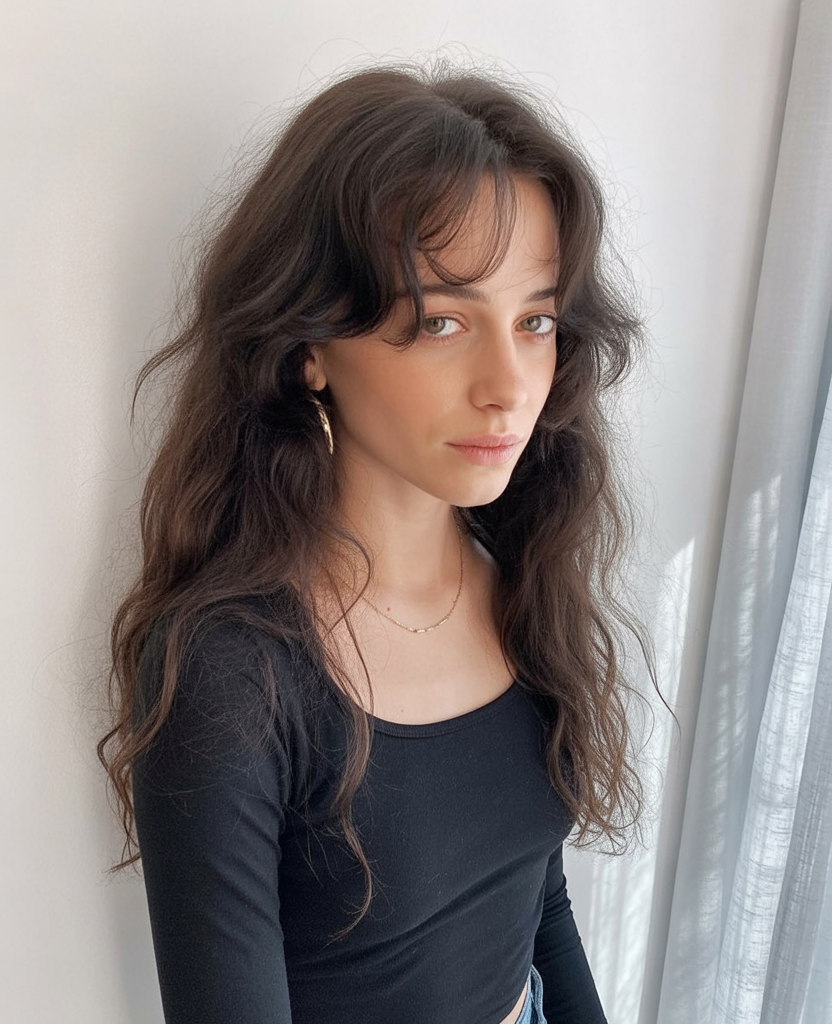 There are curtain bangs and soft waves that frame and conveniently accentuate the eyes and cheeks. The volume is provided by the layered texture, which makes the style dynamic, and the fringe at the level of the face makes a hint of retro beauty.