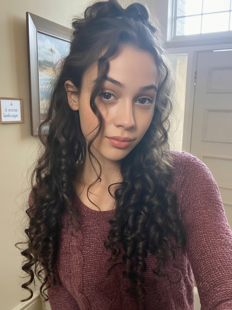 The curly half-up coupled with loose front tendrils is romantic and a bit whimsical, soft face-framing strands adding charm to it. The structured curls and raised crown make it structured and approachable.