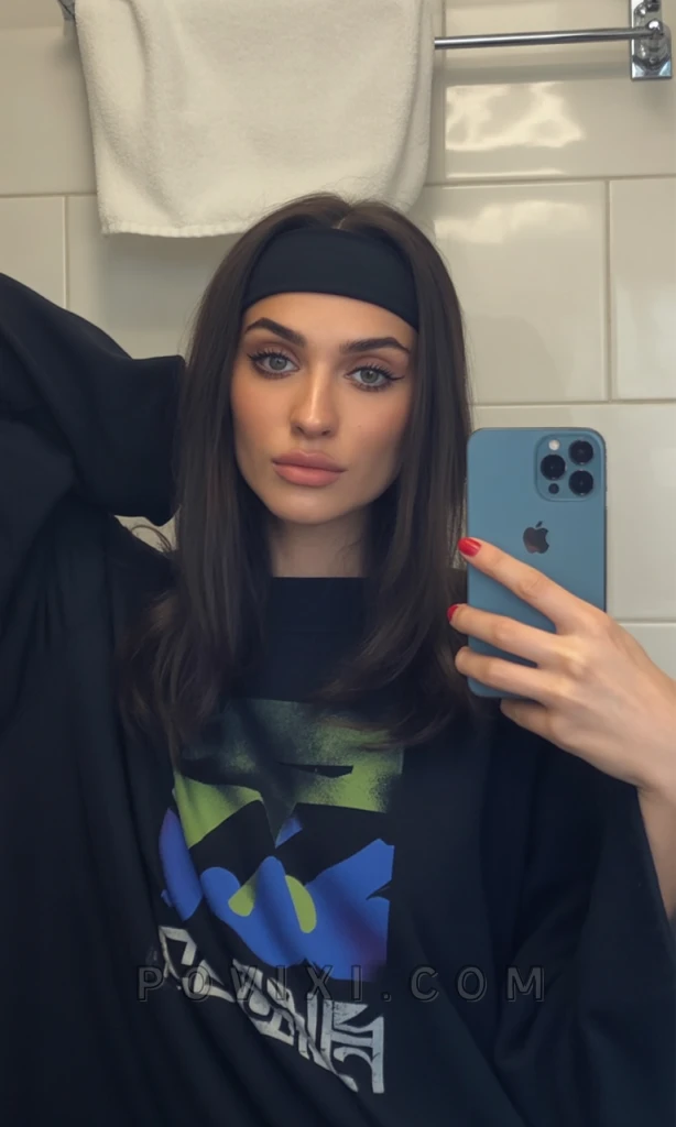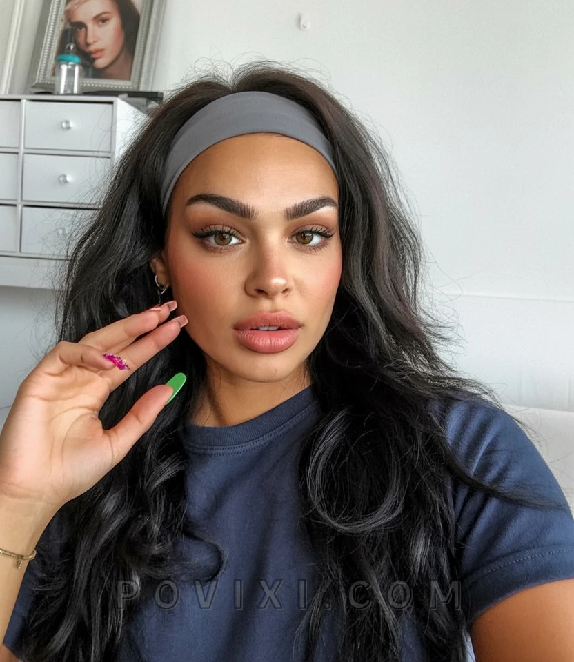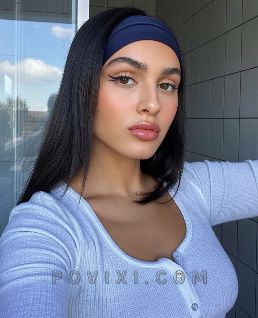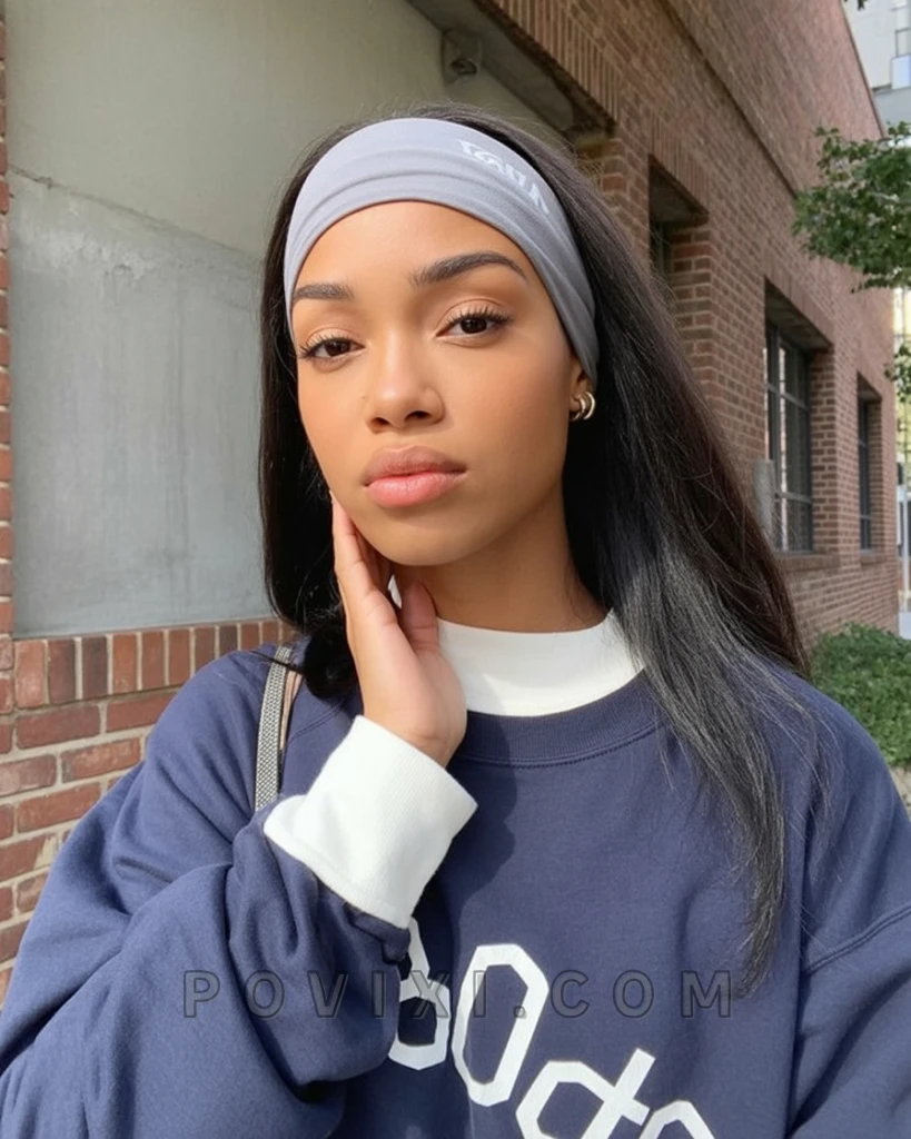 There’s something sleek and mysterious about this black stretchy headband paired with softly layered straight hair. The dark tone amplifies the intensity of the eyes and adds a touch of 90s coolness. It’s perfect for those off-duty moments when you want to look put-together but relaxed.
