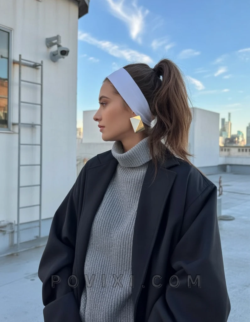 This high ponytail with a wide white headband is sleek, urban, and fashion-forward—the kind of hairstyle that looks as great on city rooftops as it does at brunch. The crisp contrast of white fabric against darker tones adds a dynamic, elevated edge that feels both cool and confident.
