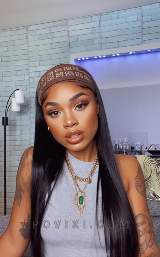 A brown bandana-style headband with intricate patterns adds warmth and personality to this sleek hairstyle. It captures that confident, bold aesthetic that Black women have mastered—modern, stylish, and unapologetically expressive. The combination of sharp eyeliner and sleek hair makes the look glow with attitude.