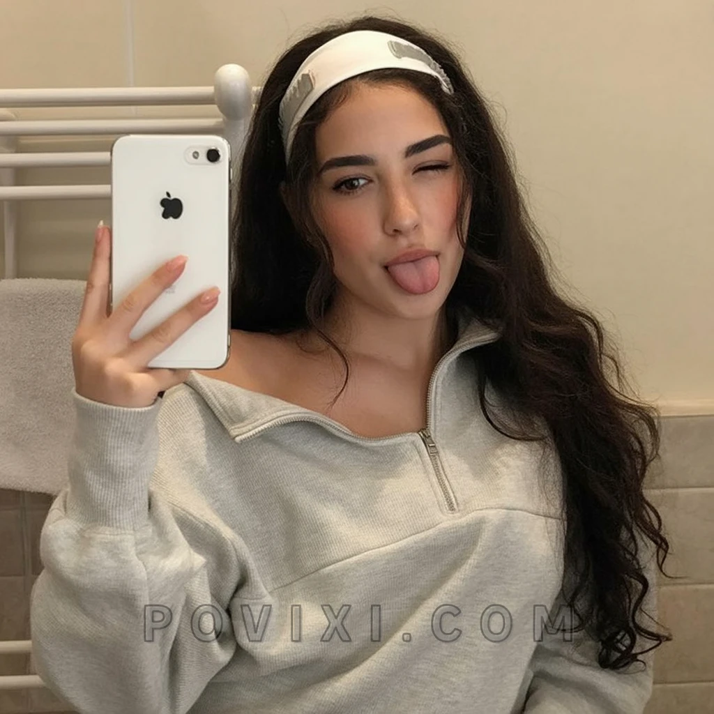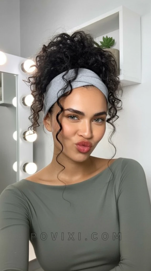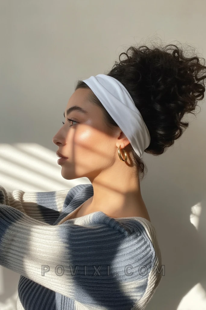 This gray stretchy headband with a high curly updo radiates playful confidence. It’s a mix of sporty and chic—perfect for those moments when you want your curls to take center stage. The single curl falling softly in front keeps the look flirty and relaxed.