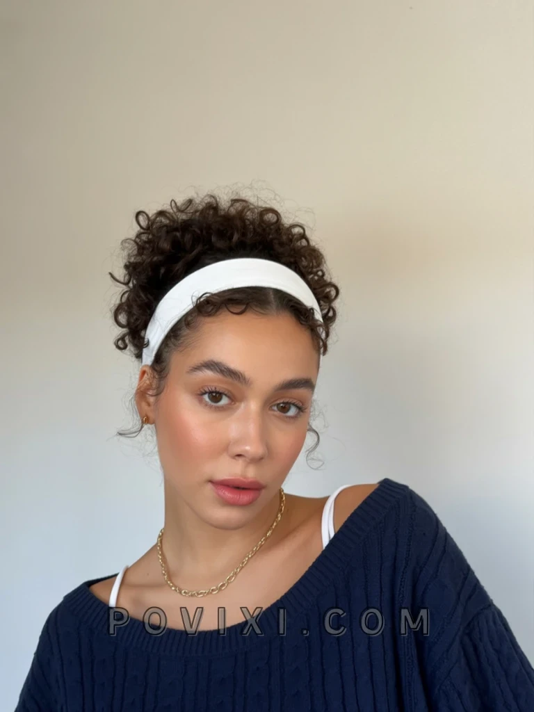 This airy, light-filled look celebrates natural curls in the most elegant way. A white cloth headband softly pulls the curls back, highlighting the face and cheekbones while keeping everything comfortable and breathable. It’s fresh and minimal and radiates effortless beauty in every curl.