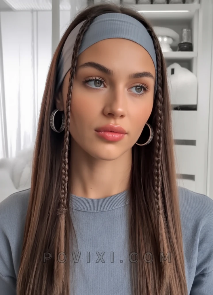 This style works best for long or medium hair, especially if your strands are straight or slightly wavy. The stretchy fabric of the headband keeps flyaways under control, while the braids add a youthful vibe. It’s ideal for active days, gym sessions, or pairing with a fun outfit for a 90s-inspired throwback look.