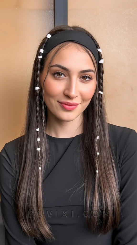 A bold black wide headband instantly adds attitude and definition to long, straight hair. The small braids tied with white beads create a subtle boho flair while keeping the overall style sleek and grown-up. It’s a fun balance between structured and free-spirited—ideal for someone who likes a little personality in their look.