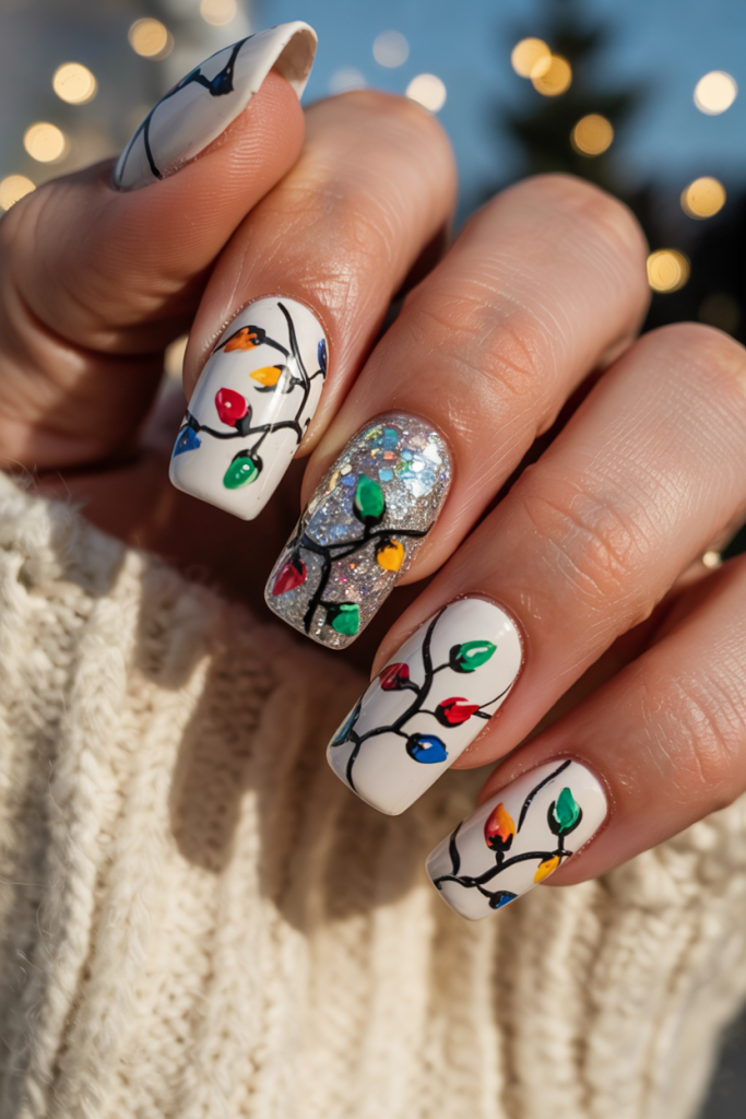 These nails are like bringing the holiday spirit right to your fingertips. The playful string light designs glow with bold red, green, yellow, and blue bulbs painted over a crisp white base, instantly reminding you of cozy evenings spent decorating the tree. The accent nail with shimmering silver glitter feels like the sparkle of fresh snow under December lights, making this look both joyful and festive.