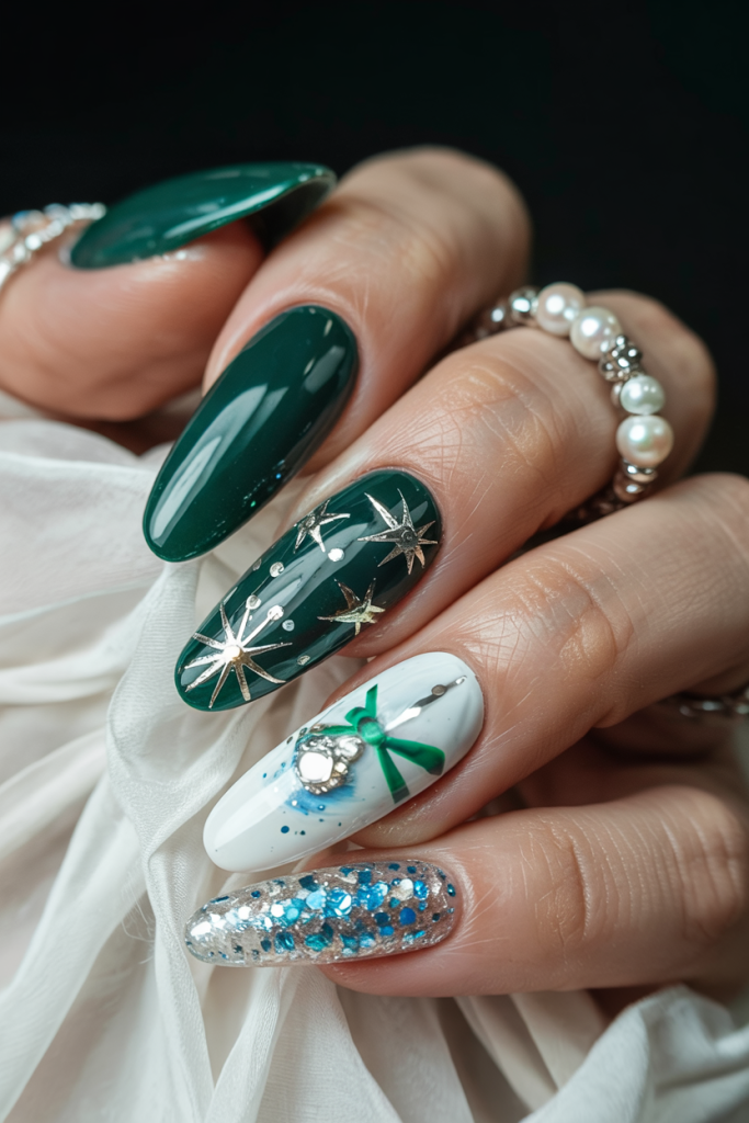 Like tiny wrapped presents at your fingertips, these nails combine deep green polish, metallic stars, and an accent nail featuring a green bow tied around white polish. Glittery silver and blue accents add extra sparkle, making this design playful yet elegant.