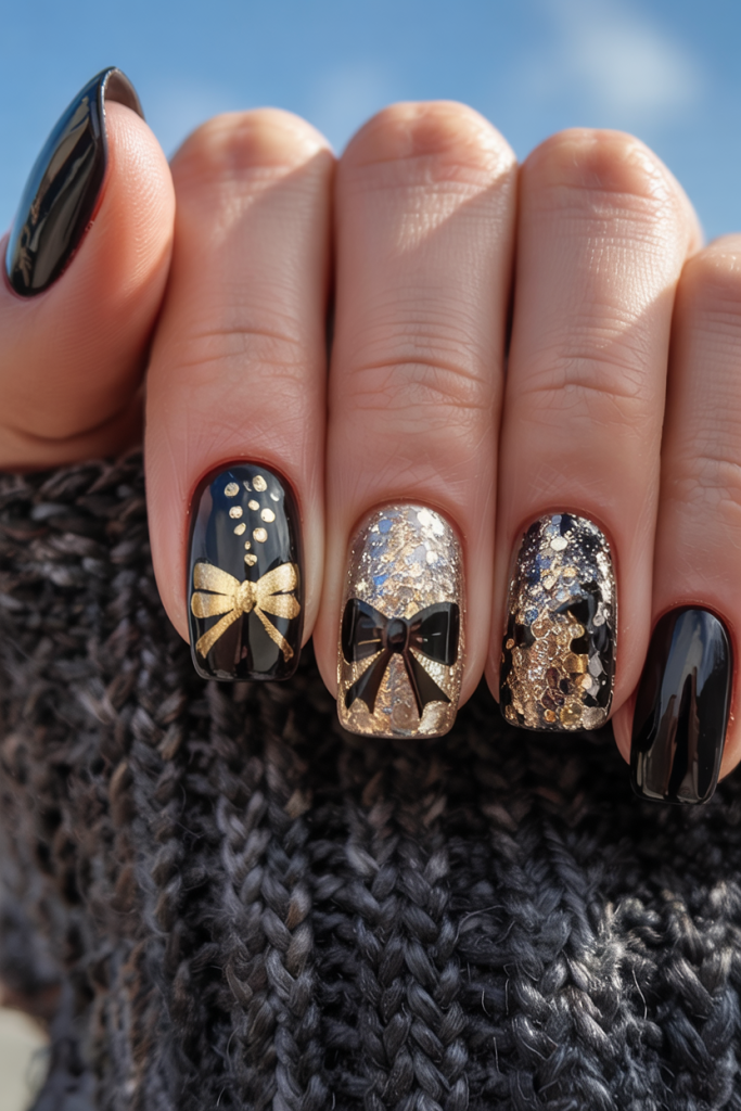 This design looks stunning on square nails and suits anyone who loves classy holiday ideas with a touch of drama. The gold and black pairing is timeless, and the bow accents add a playful twist. It’s a versatile option that can carry you through both Christmas and New Year’s celebrations.