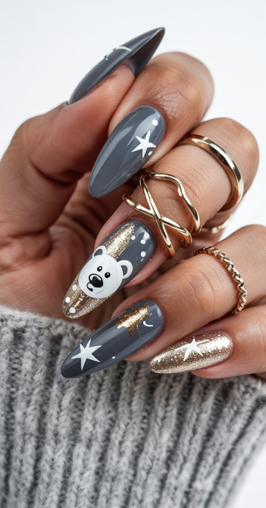 This playful design captures the magic of winter nights. A cute polar bear sits among golden glitter, white stars, and deep gray tones, creating a design that’s both whimsical and festive. It feels fun and cozy, like wearing a winter sweater in nail art form.