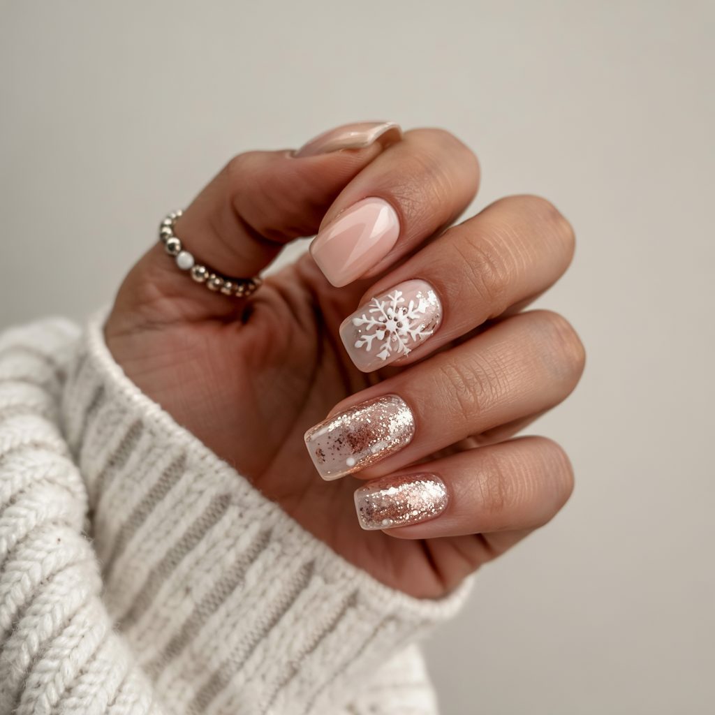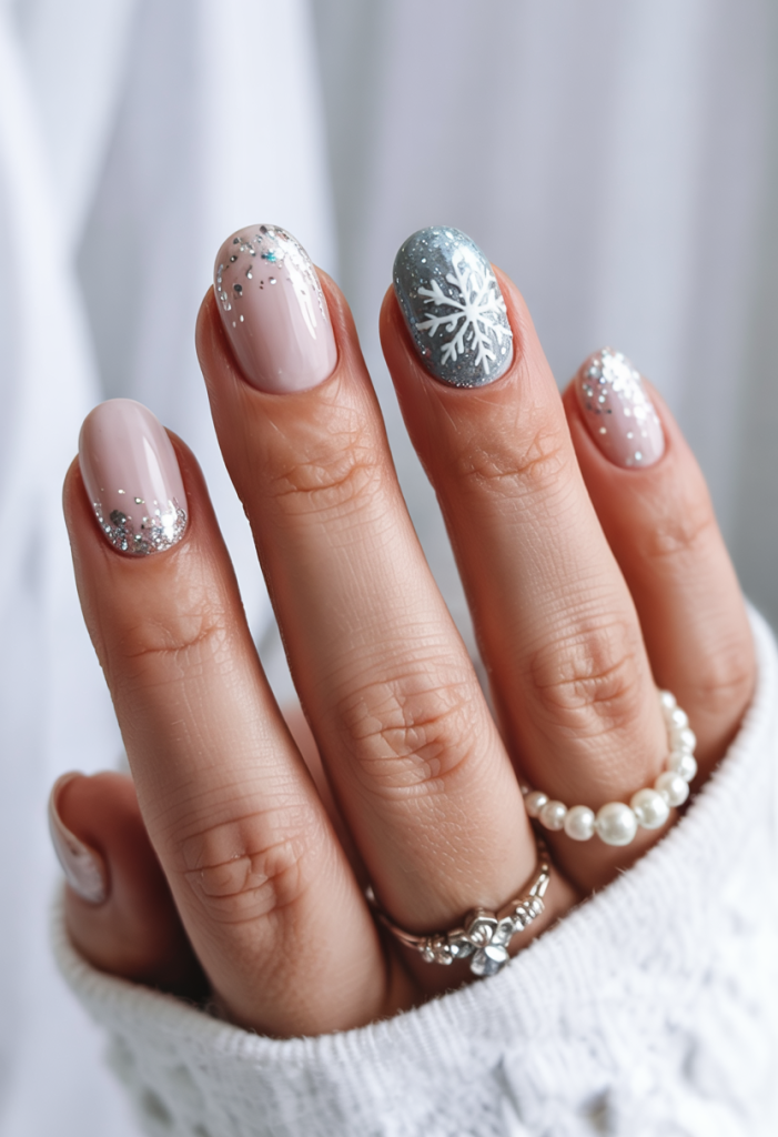 This design suits shorter nails perfectly, making it a great inspo for women who want something low-maintenance yet stylish. The glitter and snowflake details add just enough seasonal flair without overwhelming the look, making it perfect for both everyday wear and holiday parties.