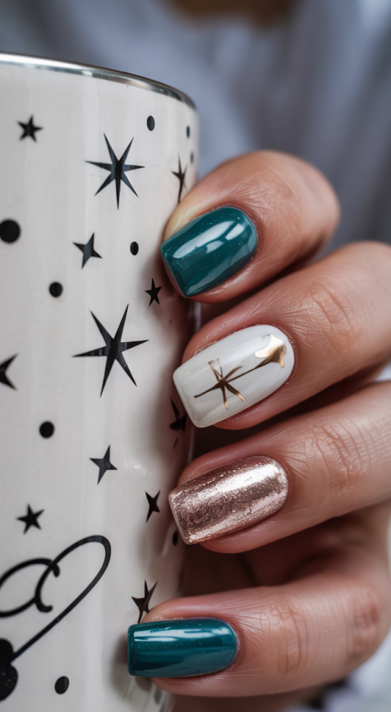 Bold green, sleek white with a golden star, and shiny rose gold accents come together for a fresh, modern holiday look. These nails feel both festive and sophisticated, with just the right mix of color and sparkle. It’s the kind of design that stands out without being too busy.