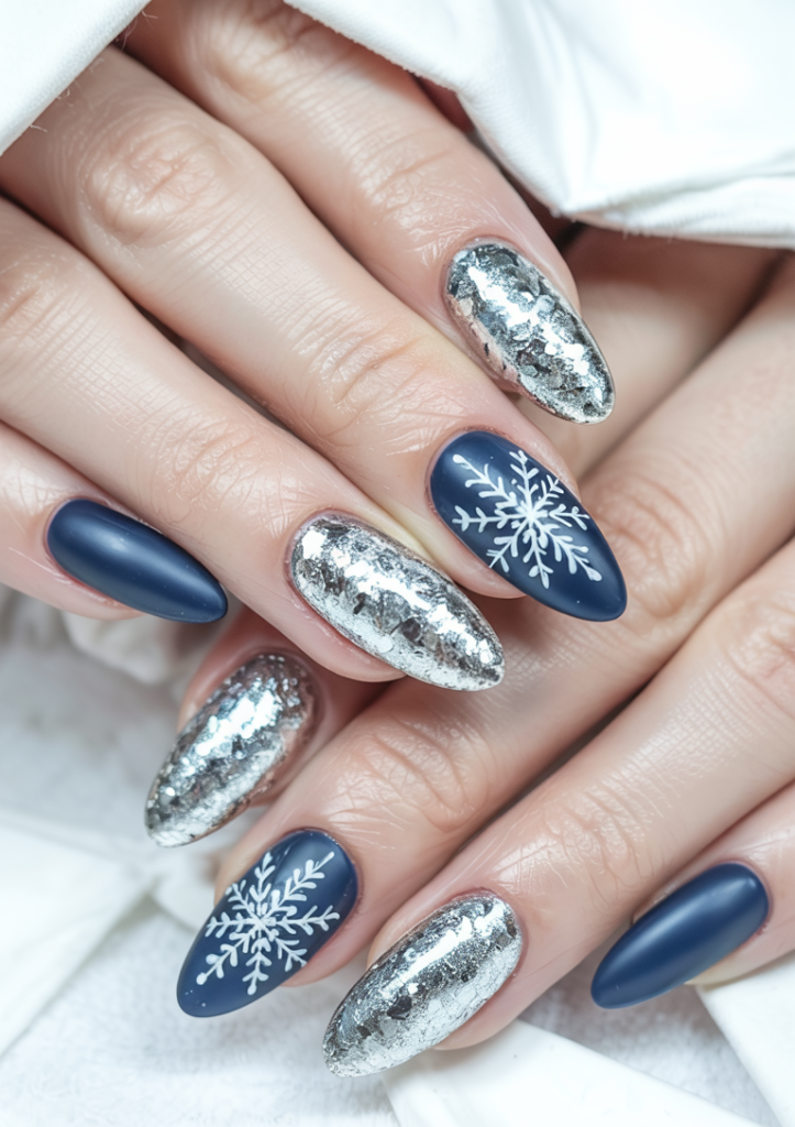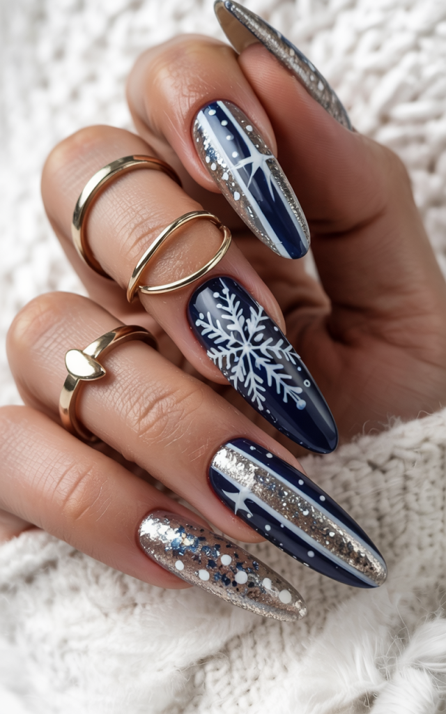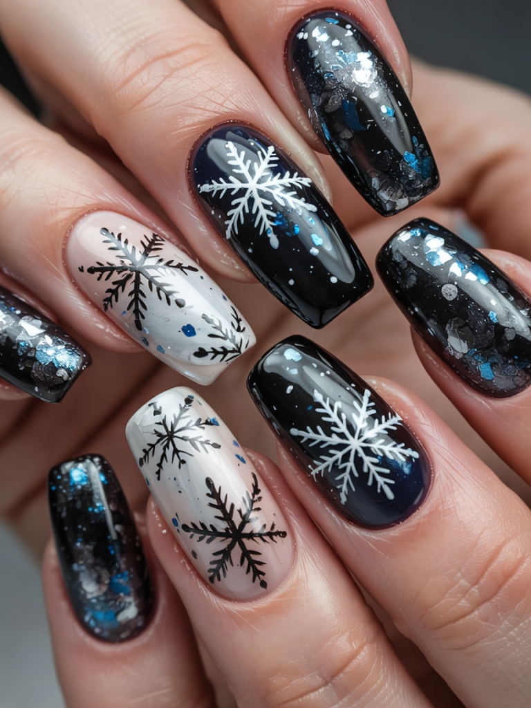 These nails feel like a winter night sky filled with snowflakes. A black and navy background, sprinkled with silver and blue glitter, makes the white snowflake art stand out dramatically. It’s a festive design that feels both bold and wintry, perfect for making a statement.