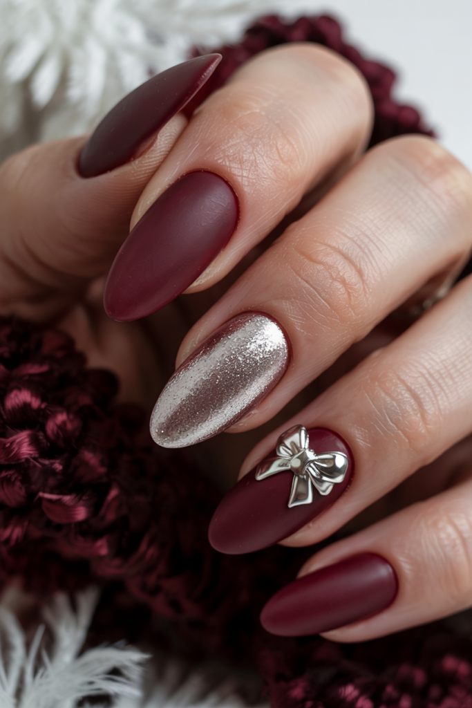 This look is the perfect mix of elegance and festivity. Deep burgundy matte nails create a rich backdrop, accented with one silver-glitter nail and a 3D metallic bow. It feels warm and celebratory, like the finishing touch to a cozy winter outfit.