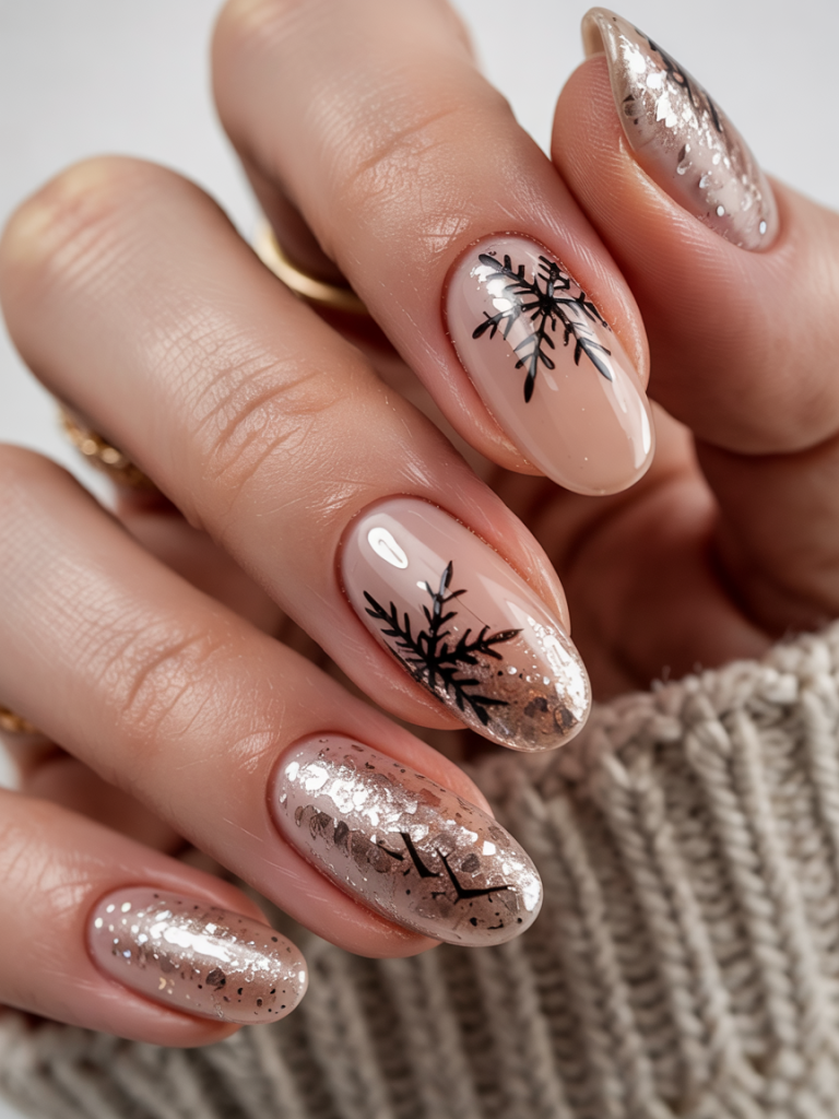 These nails are a modern spin on holiday designs. The nude base contrasting with silver glitter tips creates a soft glam vibe, while the bold black snowflakes give the design drama and style. The look is at once sophisticated and playful; truly a unique option for the season.