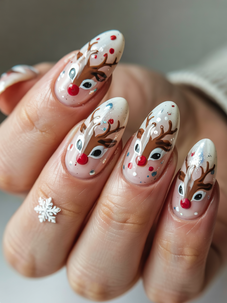 Whimsical and full of charm, these nails feature adorable reindeer faces with bright red noses and festive sparkle accents. They feel cheerful and instantly bring a smile, capturing the playful side of Christmas celebrations.