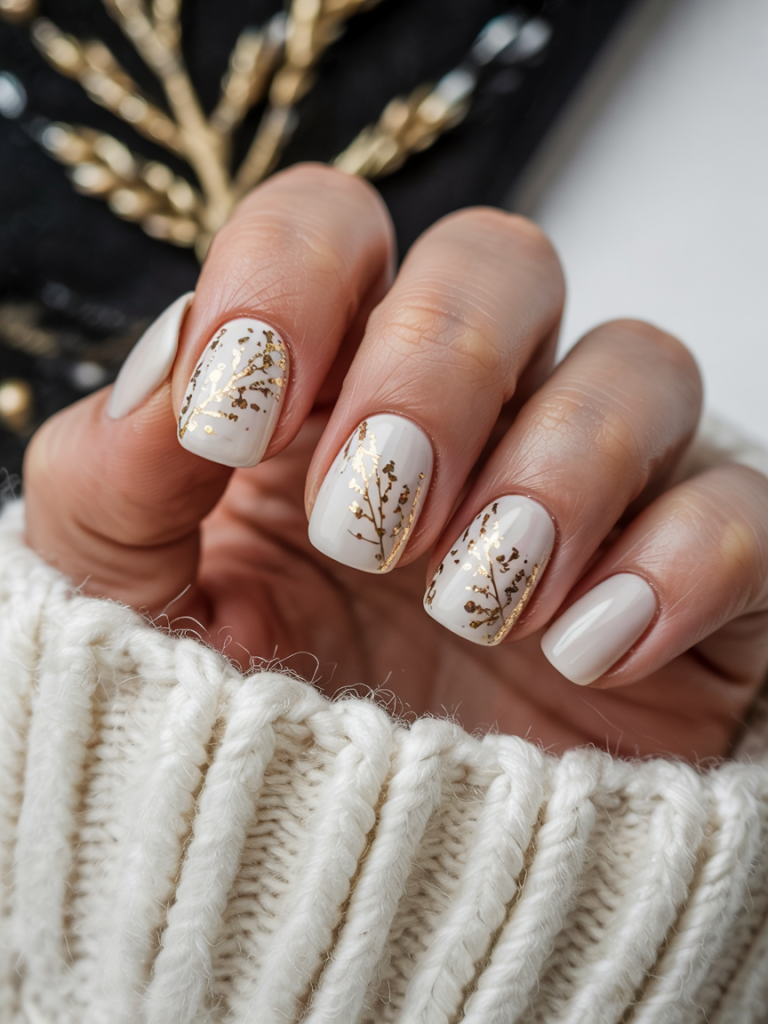 Delicate and refined, these nails pair soft white polish with golden branch-like details, creating an understated but festive design. It feels modern and clean, perfect for women who love subtle yet elegant art.