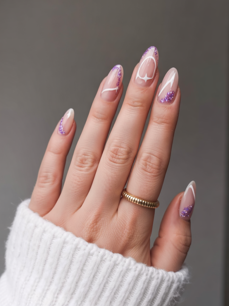 This style works best on almond nails and is perfect for those who prefer simple art that still sparkles. It’s easy to wear at both festive gatherings and everyday moments, adding just enough color to make you smile. The purple glitter adds a playful twist that feels classy yet cute, ideal for someone who wants ideas that blend subtlety with a touch of glam.