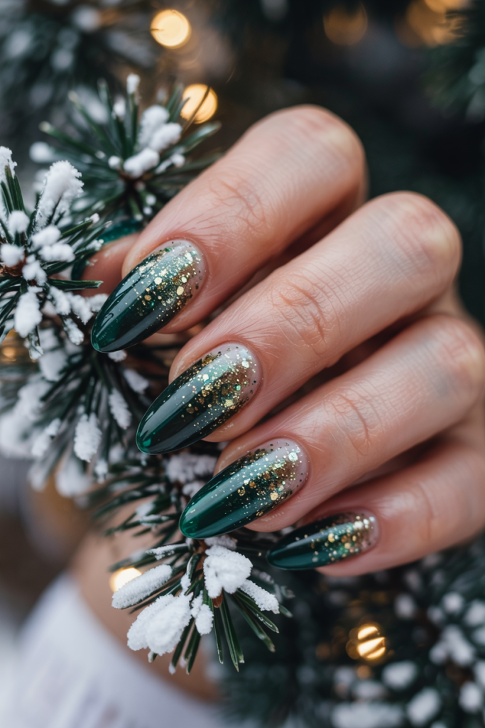 Sleigh bells go off with the beauty of these nails. Deep green fading into gold glitter-the gradient works instantly festive and classy. It’s bold, seasonally appropriate, and the very thought of holiday magic arises.